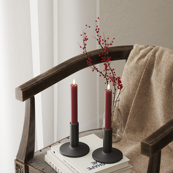 Dette elegante LED kronelys i Bordeaux tilbyder en virkelighedstro 'Real Flame'-effekt, der er så naturtro som et ægte stearinlys. Med en højde på 15 cm og en diameter på 2 cm er hvert LED kronelys omhyggeligt fremstillet i stearin & resin, udstyret med en livagtig 3D-flamme og en unik belægning af resin i toppen. Denne særlige kombination skaber ikke kun en autentisk følelse, men giver også det karakteristiske 'wet look', der efterligner smeltet stearin perfekt.