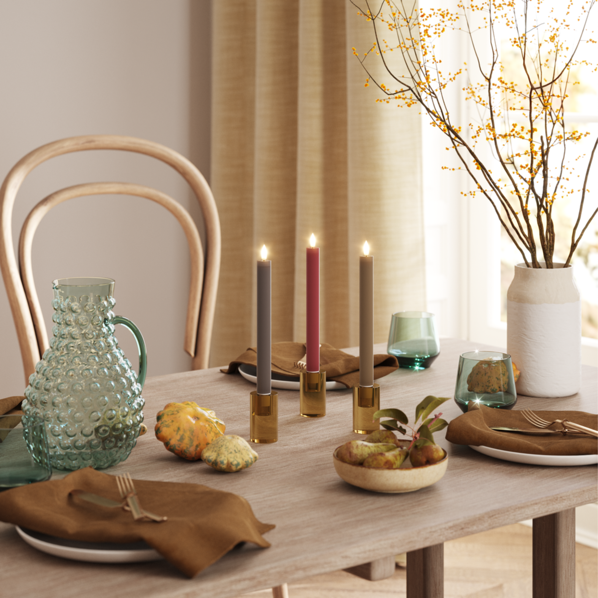 Nossas velas são cuidadosamente projetadas com um topo de resina que cria um efeito autêntico, como se as velas estivessem acesas há algum tempo. Esta característica especial torna as nossas velas incrivelmente realistas, especialmente quando a chama lança o seu brilho quente na superfície da resina.