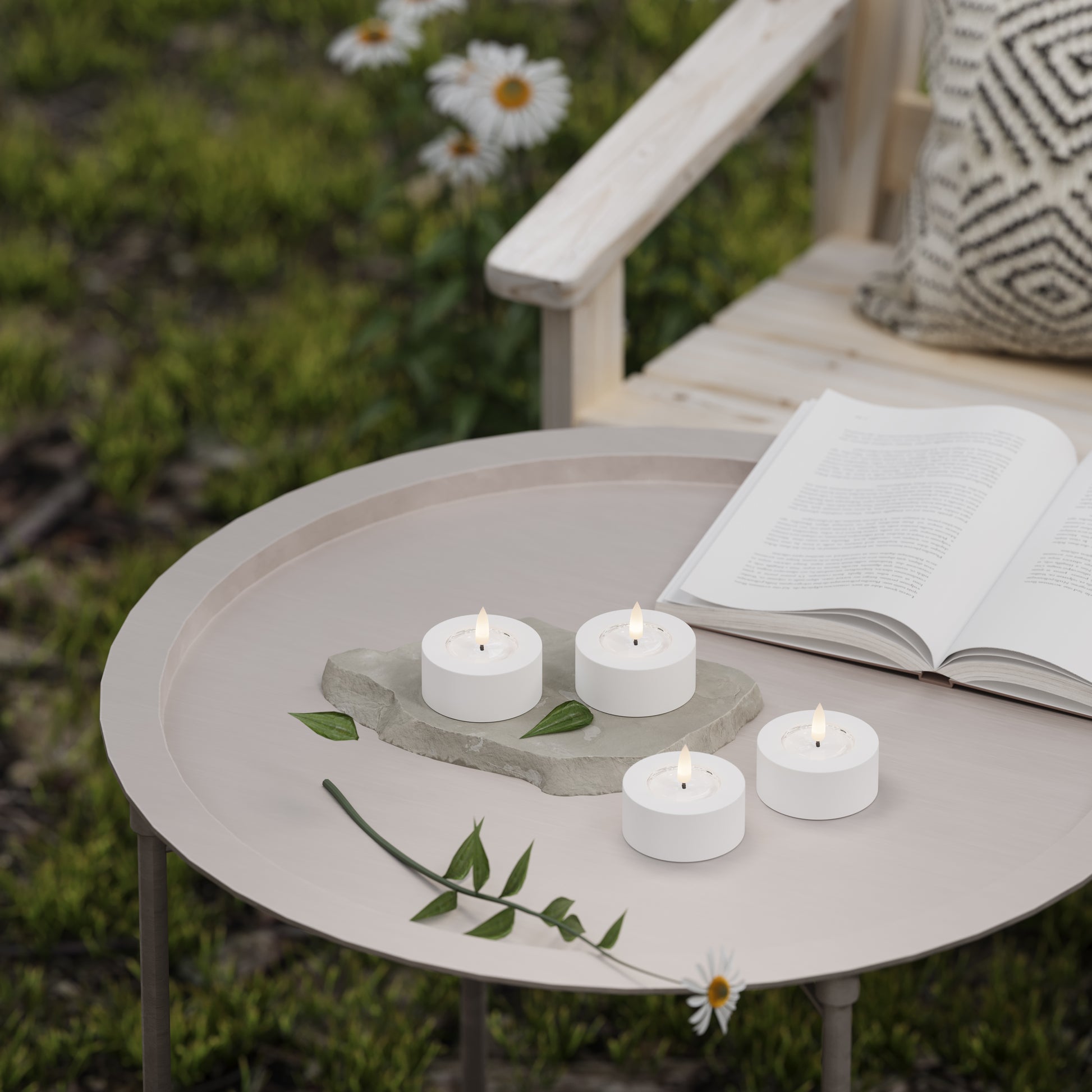 Lysene er fremstillet i slidstærk plast og afsluttet med en resin-top, som giver et elegant og naturtro look. Det gør dem til et dekorativt valg, der passer smukt i lanterner, på havebordet eller som del af en udendørs dekoration.